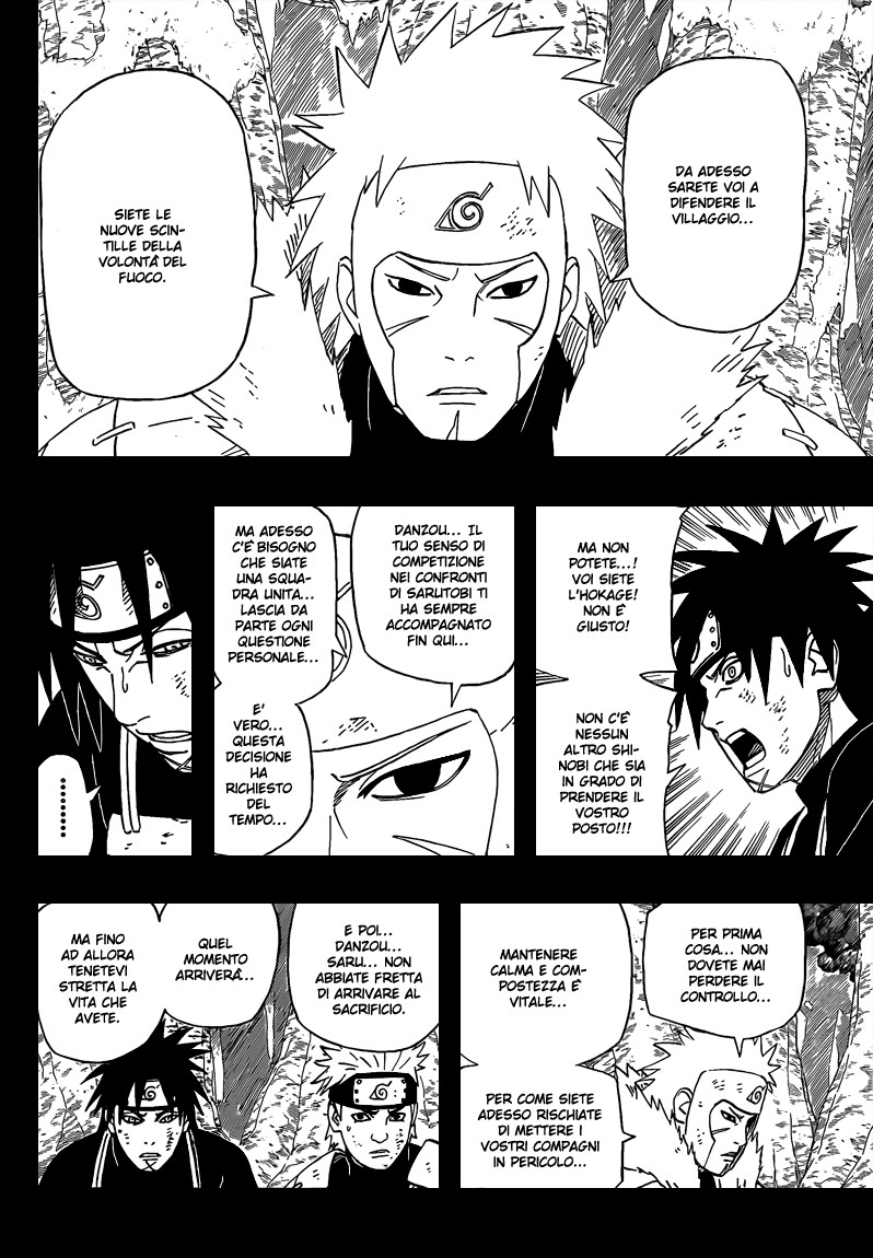 Riassunto: Finalmente capiremo perché quel dannato Danzou ce l’ha tanto col vecchio Terzo Hokage e tutto ciò che lo ha sempre circondato. Il capitolo si apre con una freddissima scena di Sasuke, deciso più che mai a vincere, che lascia morire la povera Karin, subito dopo un flashback dove un giovane Danzou fa squadra con il Secondo Hokage e un altrettanto giovane Sarutobi. La missione è difficile, serve un’esca ed è proprio in quel momento che la rabbia di Danzou esplode contro il suo compagno Sarutobi “futuro terzo Hokage” Hiruzen. Finito questo salto all’indietro finalmente il “vecchiaccio” ci lascia la pelle, ma se ne andrà senza dire niente o la venderà molto cara questa pellaccia?