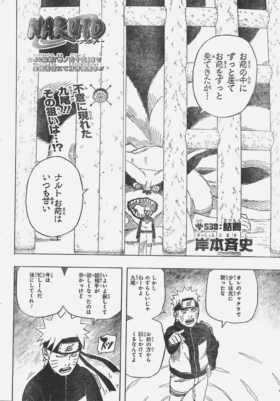 Naruto 538 – Controinterrogatorio. Devo ammettere che il titolo (questa è la traduzione letterale dal giapponese) mi ha lasciato un po’ interdetto: ci avrei visto meglio un qualcosa che avesse a che fare con il “tener testa alle domande” o “rispondere per il verso giusto”, ma si sa, i gusti sono gusti. Mi è piaciuto molto, comunque, il contenuto del dialogo tra Naruto e la Volpe (sempre più “spaventata” a mio parere da ciò che il suo ospite sta diventando): da una parte usa le solite moine per cercare di far cadere Naruto nella sua trappola, dall’altra sembra arrampicarsi in ogni modo su qualsiasi superficie liscia e riflettente ( e non solo gli usuali specchi) per dissuadere il giovane Ninja dallo scendere in campo. Paura che l’ospite muoia e che, con lui, si disperda anche il suo chakra e termini la sua esistenza? Mai mi sarei aspettato di vedere Kishimoto dipingere il “più forte” spirito esistente al mondo come un pusillanime pavido e timoroso per la sua esistenza! Grande lo sguardo e la decisione con cui Naruto affronta il suo demone interiore: una perfetta “catarsi” teatrale, in cui il classico “discorso interiore” del protagonista diventa, a tutti gli effetti, un dialogo tra il protagonista stesso e il suo io nascosto che, in questo caso, prende le sembianze della Volpe a nove code! E grande prova di Kishimoto che, questa volta, mi ha davvero colpito.