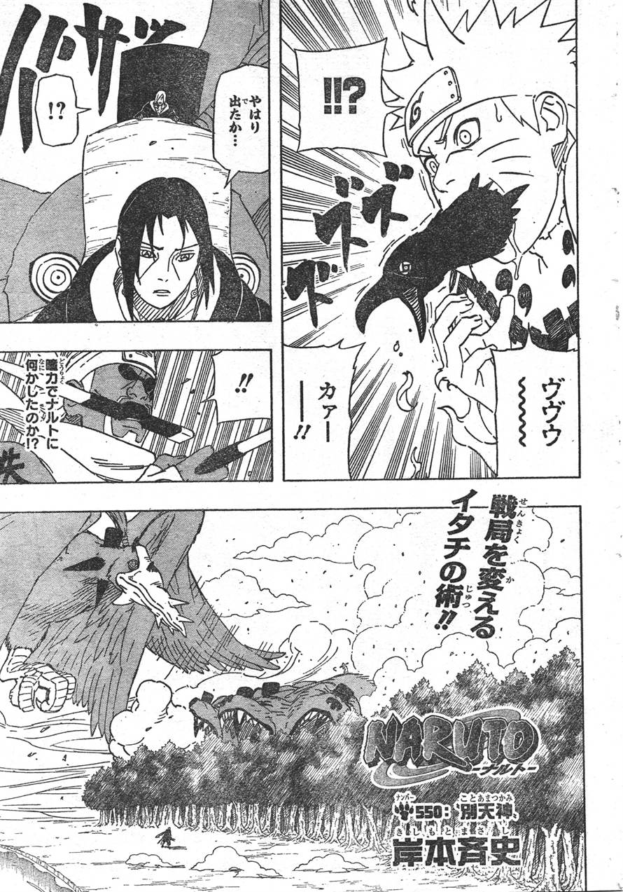 Naruto 550 – Kotoamatsumaki. Il titolo di questo capitolo, da solo, suggerisce che ci troviamo di fronte a qualcosa di fondamentale, che segnerà il futuro di questa opera: il termine 弧天紙 (kotoamatsukami) è composto dai tre kanji 弧 (koto) che è un aggettivo e significa “differente, diverso”, 天 (amatsu) anch’esso aggettivo che indica qualcosa di “divino” (e, per tradizione, è una specificazione che può essere fatta anche per chi appartiene ad una casta “imperiale”, in quanto l’Imperatore è considerato divino, appunto), e infine 紙 (kami), termine abbastanza generico per indicare una “divinità” e, in senso stretto, i “numi tutelari”. Pertanto, potremmo tradurre il titolo al modo seguente “Le essenze divine differenti” che, come potete vedere anche dalla (striminzita) pagina di Wikipedia, sono le “forze costitutive del creato, quelle che si sono generate con il nascere dell’Universo stesso (e, se scorrete la lista, dovreste leggerci dei nomi abbastanza familiari). Considerando che i precedenti poteri dello sharinganhanno tutti nomi che fanno parte di questa cerchia, viene immediatamente da pensare una cosa: Naruto ha appena ricevuto in dono l’essenza stessa del potere oculare dello sharingan, la “matrice” dalla quale i poteri di tutti gli Uchiha (e quindi viene da pensare, quelli dello stesso Madara) sono stati forgiati. Alla luce di questo, mi sembra chiaro che, se il nostro eroe saprà farne buon uso, dovrebbe essere in grado non solo di usarli ma, forse, addirittura controllare gli sharingan nemici (ormai rimasti solo a Madara e Sasuke). Il finale di questo capitolo mi ha sconcertato: da una parte Itachi si libera completamente dell’influenza di Kabuto (e lo spiegone che fa è sì completo, ma se permettete anche un po’ esagerato!), mentre dall’altro pare che, suo malgrado, Pain cada totalmente e completamente succube della Tecnica della resurrezione (e, a sua volta, pare attivare la “sua” tecnica di resurrezione). Prevedo che ne vedremo delle belle.