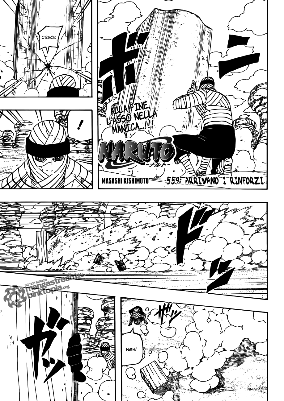 Naruto 559 – Arrivano i rinforzi. E alla fine della storia… ecco a voi Madara! E Tobi non è Madara… o forse lo è, anche se il “vero” cadavere di Madara si è appena mostrato a tutti? Sarà mica che allora Tobi è davvero Obito, salvatosi per miracolo dopo aver ceduto l’occhio a Kakashi e desideroso di vendicarsi del Villaggio della Foglia (perché, resta un mistero!)? E Naruto, ormai stremato dalla tecnica di clonazione? Ciononostante la vittoria su tutti i fronti è “archiviata”, anche se adesso si fanno avanti forse i due scontri più complessi: da una parte Kabuto con il suo pupazzo Madara contro Naruto (ma non è quello vero!), dall’altra Tobi che sta puntando da qualche parte, e sulle cui tracce, presumibilmente, ci sono il vero Naruto e Bee. E intanto Sasuke? Ho idea che a breve inizieranno a pioverci addosso delle rivelazioni, forse anche dei flashback… e prevedo che non saranno tanto piacevoli!