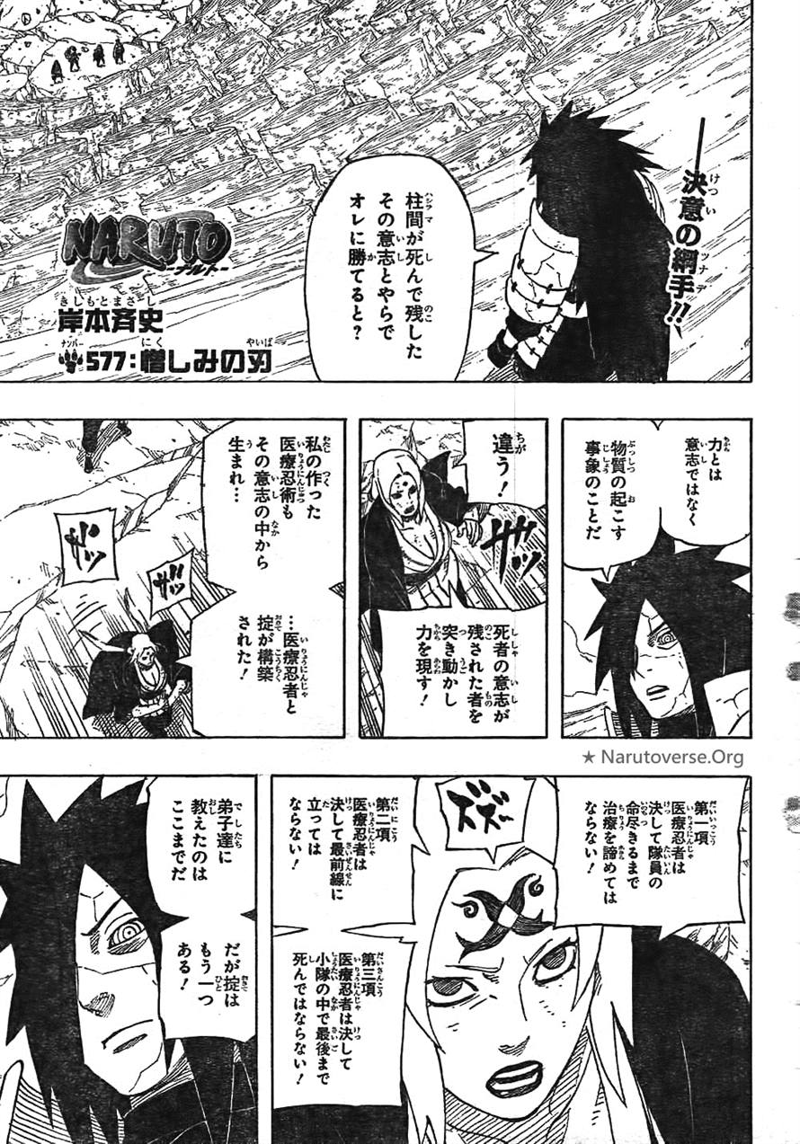 Naruto 577 – La spada del rancore. Come dicevo, in sé per sé il capitolo non presenta immagini o situazioni scioccanti al pari degli altri due: l’unico fatto peculiare, dal punto di vista del colpo di scena, è la ferita inferta a Tsunade da parte di Madara e, se proprio lo vogliamo citare, l’arrivo di Itachi nel covo di Orochibuto (ma quello sapevamo già che sarebbe accaduto prima o poi). Tuttavia, il capitolo presenta uno spunto di riflessione non banale, che trova il suo fulcro proprio nel dialogo tra Tsunade e Madara relativo al “guarire vs resuscitare” i propri compagni. Purtroppo, l’unica RAW che sono riuscito a trovare non era ben leggibile in alcuni punti, per cui quello che sto dicendo sono delle “speculazioni” più che delle vere e proprie certezza, e fanno tutte riferimento al discorso di Madara a pagina 7. Nelle differenti traduzioni trovate su internet, non è ben chiaro quale sia il senso del discorso: leggendo la RAW mi sono convinto che le interpretazioni probabili sono solo 2. La prima è che Madara voglia solo sminuire le convinzioni del Quinto Hokage, affermando che, piuttosto che insegnare come guarire dalle ferite, bisognerebbe trovare un metodo efficace, se si vuole vincere sempre e comunque, per non morire mai, un po’ come è accaduto a lui grazie all’Edo Tensei: tale interpretazione è del tutto plausibile, e lascia, sostanzialmente, tutte le considerazioni fatte fino ad ora nello stesso stato, senza modificare niente alla storia che conosciamo. La seconda interpretazione, tuttavia, è quella che mi ha fatto pensare: si potrebbe credere che Madara non solo sminuisca il metodo Tsunade, ma che, addirittura, affermi che lui, a differenza del Primo Hokage, aveva proceduto su un percorso lungo il quale aveva fatto in modo di insegnare ai suoi sottoposti (e discendenti) una tecnica per ritornare in vita dopo la morte. Ora, se l’interpretazione corretta di questo dialogo fosse la seconda (e, vi ripeto, al momento non ho trovato una RAW migliore per capirlo) la situazione si fa ingarbugliata: in primis, si potrebbe pensare che è lo stesso clan Uchiha ad aver sperimentato, all’inizio, l’Edo Tensei. Se così fosse, ci sarebbe una motivazione ulteriore nel comprendere perché ad Itachi venne ordinato di sterminare tutto il suo clan (un esercito di persone che avrebbero potuto tornare in vita? Immagino che ai piani alti di Konoha se la siano fatta addosso!); risulterebbe ovvio pensare che Orochimaru abbia scoperto, in qualche modo, questi segreti e gli abbia fatti suoi per migliorare la tecnica; infine sarebbe possibile che, in qualche modo, Tobi sia un altro possibile “ritornato” del clan e che quindi Sasuke non sia l’unico sopravvissuto. In ogni caso, appena potrò confermare quale delle due è la visione corretta, ve lo farò sapere. Per finire, una osservazione sul ferimento di Tsunade: è possibile che il Quinto Hokage muoia. Non dico questo perché potrebbe risultare ovvio dal punto di vista della sceneggiatura (Tsunade muore, Naruto sconfigge tutti e diventa Sesto Hokage), ma piuttosto perché la morte di un tale personaggio avrebbe un significato profondamente “buddista” e sappiamo che Kishimoto, quando può, cerca sempre di inserire tali idee nel suo manga (amicizia, sacrificio, speranza, ecc. sono tutti argomenti trattati in un ottica filosofico-religiosa in Naruto): la triade dei Ninja Leggendari è ormai alla fine, con Jiraiya morto e Orochimaru “mutato” in qualcosa di diverso (e, se seguiamo il filo dell’ovvietà, probabilmente presto accoppato da Itachi… o Sasuke!), per cui la fine di Tsunade servirebbe a sancire, ancora una volta, il concetto che “si è chiusa un’era, se ne apre una nuova” che ormai è un punto fondamentale di questa storia sin dalla riunione dei 5 Kage. Pertanto non mi stupirei se, in breve, sparissero nel nulla sia Orochibuto, che tutti i 5 Kage, in un ultimo, spettacolare, attacco contro un “morente” Madara, prossimo alla fine per lo scioglimento della tecnica della Resurrezione.