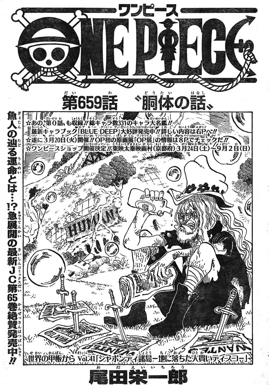 One Piece 659 – Per quanto riguarda il mio busto. E Oda ci frega ancora una volta! Certo, dopo che il Samurai ci rivela che il suo “busto” sta facendo qualcosa di strano (e vediamo un Brook terrorizzato tirare di scherma con un corpo privo di gambe e testa) e risulta ovvio che le gambe che Rufy si tira dietro appartengono allo stesso individuo, doveva risultare ovvio che il “potere” che aveva fatto a pezzi il samurai stesso altri non poteva essere che quello di Trafalgar Law… che appare alla fine del capitolo, nelle vesti di uno dei membri della Flotta dei Sette! Ovviamente qui partono una serie di interrogativi: 1) come ha fatto e perché Law è entrato negli Shichibukai; 2) chi siano gli altri nuovi membri, supponendo che, in linea di massima, attualmente nelle loro fila militino solo Orso (forse) e Doflamingo degli originali (forse anche Mihawk, ma non saprei dire che fine abbia fatto attualmente!); 3) sarà davvero Law (io ne dubito) il fantomatico Boss di Punk Hazard, quello che viene presentato come un ammasso fumoso indefinito? Io ne dubito fortemente, ma a questo punto mi chiedo quali interessi possa avere Law nell’isola e che legame ci sia tra lui e quelli che, attualmente, conducono le varie ricerche. D’altra parte, sembra che, in effetti, tutti gli uomini/animale dell’isola dipendano da questo Boss, e a questo punto sarei curioso di capire che razza di individuo esso sia (perché, mi pare a questo punto naturale pensare che sicuramente non sia l’artefice degli “innesti”, cosa probabilmente attuata da Law il quale, come medico, potrebbe stare pensando di portare avanti qualche suo personale esperimento). La cosa che a questo punto mi solletica di più la curiosità, è la presenza dei bambini: quale sia il motivo del loro rapimento o il modo in cui vengono “usati” in Punk Hazard credo sia fondamentale per capire l’andamento di questa saga, che promette di essere davvero esplosiva (se sottintende un possibile scontro Rufy vs Law!).