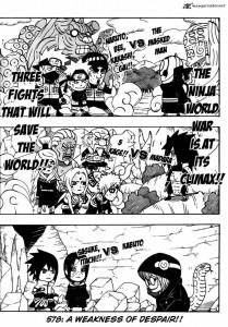 Naruto 578 – La debolezza della disperazione. Per prima cosa, una nota sul titolo: mi chiedo se chi traduce (italiani e non) conoscano i modi di dire e si rendano conto quando un autore fa una “citazione” o una “parafrasi”. In italiano si dice: “La forza della disperazione”, qui, Kishimoto, ha voluto invece mettere in bocca a Madara, in tono sarcastico, una locuzione che rendesse l’esatto contrario. I 5 Kage, disperati, lo affrontano: ma, a discapito del detto, i loro sforzi risultano inutili, in quanto risultano comunque deboli rispetto al “5 contro 1” (che detto così, sembra una cosa sconcia) che il redivivo capo clan Uchiha schiera contro i suoi avversari! Il tono sarcastico dell’ultima battuta poi (“Volete che i cloni usino Susanoo?”) se da una parte fa “sorridere”, dall’altra fa presagire una sicurezza da parte del possessore dello Sharingan che dovrebbe far temere per la vita dei 5 guerrieri (e, secondo me, qui presto assisteremo a un bel po’ di funerali!). Sull’altro versante, ho trovato un po’ deludente la reazione di Sasuke: bambino ubbidiente con Itachi, bambino capriccioso con Orochibuto. Ragazzino, ormai sei grande, prendi una decisione: che cavolo ne vuoi fare della tua vita? Orochibuto, invece, mi inquieta sempre più: troppo sicuro del fatto che l’Edo Tensei non presenti rischi da poter trasalire, così tanto, alle parole di Itachi, secondo il quale lui stesso è la prova dell’esistenza di un “rischio” e di un “Punto debole” nella tecnica della resurrezione. Ho come l’impressione che entrambi sappiano più di quello che, fino ad ora, hanno voluto svelare… staremo a vedere. Una domanda: ma quel corvo morto all’ingresso della grotta? Quando è successo? Infine, ho apprezzato molto la pagina iniziale, in SD, che riassume, in breve, i futuri scontri a cui dovremo assistere: e ora che tutti i pedoni sono disposti sulla scacchiera, si dia il via alle danze!