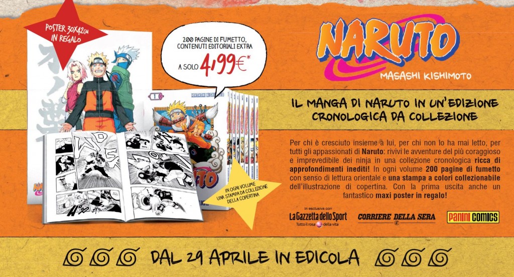 Per quanto riguarda i fan italiani, il momento di salutare il manga di Naruto arriverà a dicembre di quest’anno, quando la Panini pubblicherà l’ultimo volumetto della serie. Nasce in questo frangente un’iniziativa de La Gazzetta dello Sport che, per porre i suoi omaggi a Naruto, a partire da domani, 29 aprile, pubblicherà il manga in un’edizione speciale.