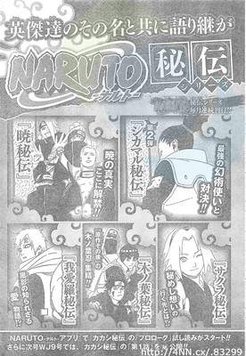 A cominciare dal mese di febbraio, un nuovo volume della serie di romanzi Hiden (che significa la leggenda segreta) sarà pubblicato a cadenza mensile. Il primo romanzo, scritto da Akira Higashiyama e intitolato Naruto – Kakashi Hiden: Hyōten no Ikazuchi (Naruto – Kakashi Hiden: lampi nel cielo ghiacciato), è uscito in giappone il 4 febbraio.
