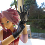 Figure: veniamo ora al soggetto principale della composizione, Sakura Haruno, che qui vediamo in posa mentre si sistema un guanto, trionfante su un letto di nemici sconfitti. Essendo ripresa dalla cover #30 si può fare un rapido raffronto e la somiglianza con la controparte cartacea è più che ottima, soddisfacente anche la rappresentazione del corpo che in quell’immagine non è presente. Tsume solitamente lavora solo con Polystone, in questo caso abbiamo inserti in PVC negli abiti che garantiscono una maggiore malleabilità e facilità a rappresentare superfici sottili come il gonnellino svolazzante di Sakura. Sculpting e colorazione sono ai massimi livelli, curati in ogni dettaglio e senza sbavature. Menzione d’onor per capelli e mani, scolpite e colorate con estrema cura dei dettagli e realizzate in maniera semplicemente divina.