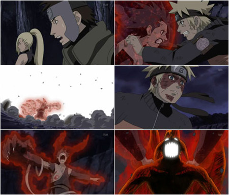 Riassunto. Mentre Asuma combatte contro Kazuma, gli altri tentano di fermare Sora che ormai ha perso il controllo e ha prodotto la quarta coda della Volpe. Naruto continua a chiamare Sora, convinto che questi sia ancora cosciente, ma appena lo tocca inizia a trasformarsi anche lui in Volpe. Kazuma spiega che finchè i due saranno vicini, il potere della Volpe continuerà ad aumentare fino a distruggere il villaggio. Naruto invece riesce a bloccare la trasformazione con la sua forza di volontà e incita Sora a fare altrettanto.