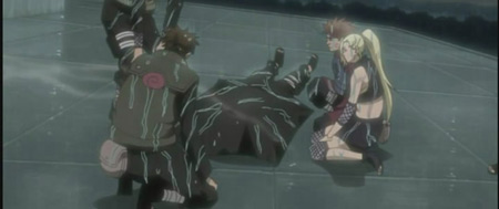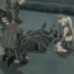 Riassunto. Ormai Asuma sembra prossimo alla morte ma i due membri di Alba vengono fermati dal team composto da Chouji, Ino, Raido e Aoba. Hidan e Kakuzu vengono contattati da Pain, che gli ordina di raggiungere gli altri per sigillare l’ultimo cercoterio catturato e questi se ne vanno.