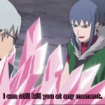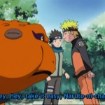 Riassunto: Kabuto affida Y?kimaru a Guren. Naruto prova ad insegnare a Gamakichi e Gamatatsu le tecniche d’acqua, mentre Kiba scopre che il nemico fa uso di pipistrelli e Shino trova un insetto sopravvissuto agli attacchi di Guren. Tsunade decide di mandare Yamato, Sai e Sakura come supporto a Kakashi senza dire niente a Naruto. Y?kimaru si ammala e così lui e Guren sono costretti a passare la notte in un capanno.