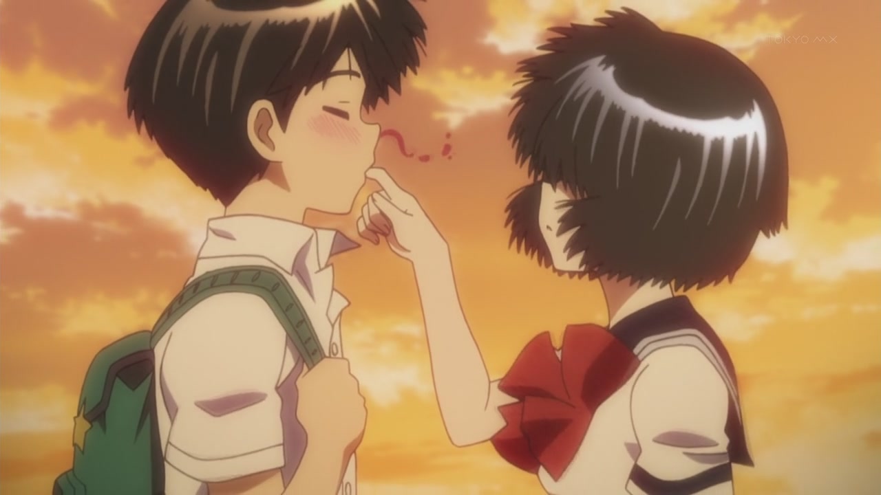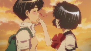 Due sono i problemi che ho riscontrato in questa serie. Il primo è Mikoto Urabe, il motivo per cui non seguii la serie è che la protagonista non mi piacque come personaggio: difetto fatale quanto ci si trova di fronte a una commedia sentimentale. Il fatto è che fondamentalmente non sono mai troppo interessato a personaggi di questo tipo: strambi, incomprensibili e silenziosi. Andando avanti con la visione questa cosa non migliora, perchè Urabe resta quel personaggio di cui non sappiamo niente, fino al momento in cui, nella seconda metà della serie, qualcosa cambia e dalle sue prime reazioni spontanee come imbarazzo e rossori è possibile ufficialmente statare che perlomeno è un essere umano, sebbene le continue inquadrature al suo portachiavi a forma di astronave aliena siano abbastanza preoccupanti: ancora cerco di capire cosa voglia dirci con questo l’autore. Il secondo punto è proprio legato alla relazione tra i due protagonisti: la capacità di comunicarsi l’un l’altro lo stato d’animo attraverso la condivisione di saliva li pone su un piano privilegiato rispetto a molte altre coppie, poichè sono in grado di comprendersi anche attraverso un linguaggio non fraintendibile di tipo non-verbale; fatto sta che ho risentito troppo della frustrante mancanza di dialogo nella loro relazione. Urabe dipende troppo (altro motivo per cui non apprezzo troppo questo personaggio ndRegola) da questo metodo di comunicazione col suo ragazzo, quasi vada sempre alla ricerca di una scorciatoia che le permetta di superare l’imbarazzo dovuto ai propri sentimenti, e il povero Akira rimane quasi sempre con una spiegazione che deve realizzare da sè. La cosa mi ha un pò infastidito, alla lunga, se devo essere sincero, nonostante col tempo vada a strutturare e mantenere una stabile e reciproca fiducia tra i due. Sul protagonista maschile, invece, ho ben poco da dire, figura molto classica che cresce e matura nel corso della serie in modi che ho riscontrato essere molto verosimili.