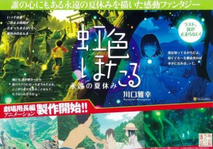 Sono stati svelati il cast e l’artista responsabile della canzone principale del prossimo film d’animazione della Toei Animation, Niji-Iro Hotaru ~Eien no Natsu Yasumi~ (Lucciole color arcobaleno: la vacanza dell’estate eterna). Il giovane attore di quattordici anni Akashi Takei (Ima Ai ni Yukimasu) doppierà il protagonista, Yuuta, mentre Ayumi Kimura doppierà Saeko. Altri membri del cast includono Takahiro Sakurai, Mamiko Noto, Kazuya Nakai, Chikao Ohtsuka e Tarô Ishida.