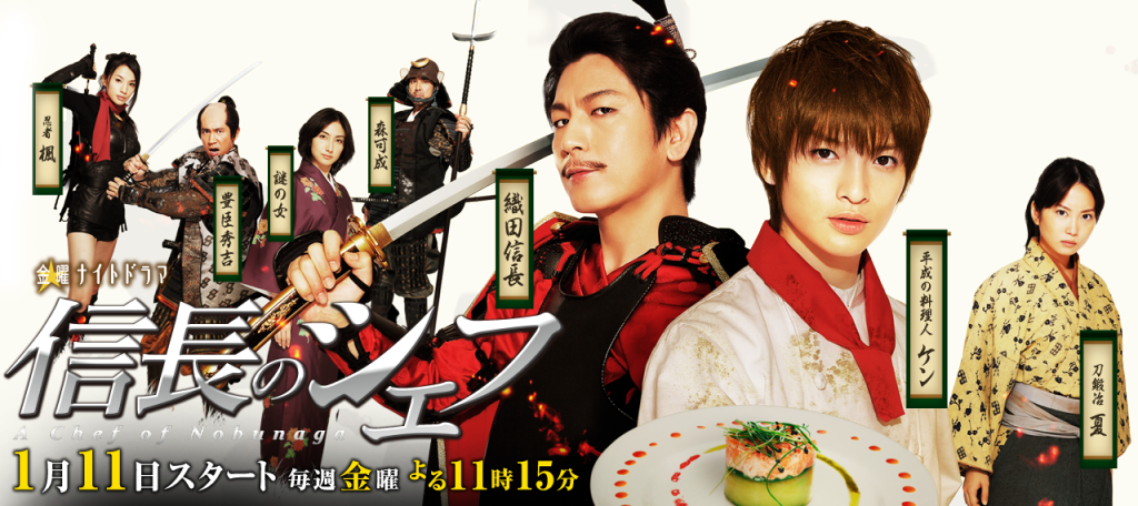 L’attore e membro del gruppi di idol Kis-My-Ft2 Yūta Tamamori, già interprete dei lungometraggi ATARU: THE FIRST LOVE & THE LAST KILL, Shiritsu Bakaleya Koukou e Gokusen: The Movie e delle serie televisive Pin to Kona, ATARU, Saikou no Jinsei no Owarikata~Ending Planner~, Ikemen desu ne e Shiawase ni Narou yo, ha interpretato nella prima serie di Nobunaga no Chef il personaggio di Ken, uno chef francese dei nostri giorni che si ritrova trasportato indietro nel tempo all’epoca di Nobunaga. Mentre Ken cerca di destreggiarsi in un Giappone non proprio pacifico, Oda Nobunaga si interessa a lui e lo assume come suo chef personale. L’attore Mitsuhiro Oikawa (20th Century Boys, Nodame Cantabile) è il co-protagonista della serie nei panni dello stesso Nobunaga.