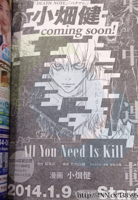 Nell’uscita di Martedì di Weekly Shonen Jump della Shueisha verrà annunciata la nuova opera di Takeshi Obata, disegnatore già famoso per Death Note, Bakuman e Hikaru no Go: si tratta questa volta di un adattamento manga della novel di Hiroshi Sakurazaka All You Need is Kill. Ad affiancare Obata nell’adattamento ci sarà Ryosuke Takeuchi (ST&RS), mentre per il character design dei personaggi il disegnatore si baserà sul lavoro di Yoshitoshi Abe, che ha curato le illustrazioni della novel. Abe è famoso per aver lavorato anche a Serial Experiment Lain e Texhnolyze; questa nuova miniserie inizierà su Weekly Shonen Jump il 9 Gennaio.