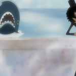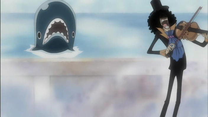 In seguito parte un flashback (inedito) nel quale la ciurma di Brook incontra la allora piccola balena. Si ritorna allo scontro, durante il quale Brook viene colpito fatalmente.