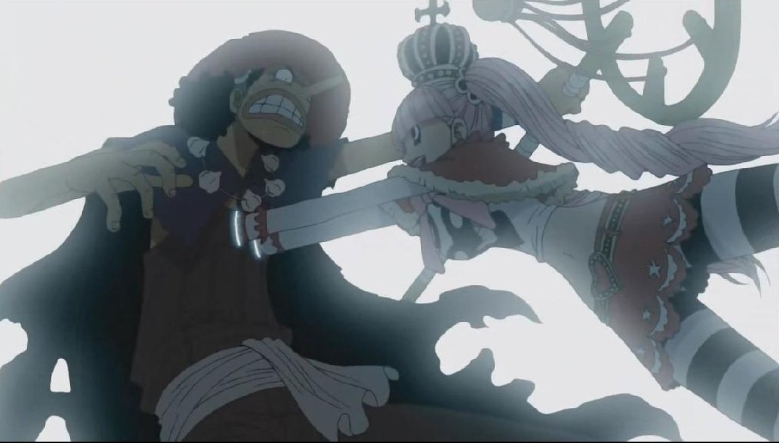 La scena si sposta sul combattimento tra Usop e la principessa Perona la quale sta fluttuando in aria. Usop è sbigottito e allo stesso tempo spaventato; improvvisamente i suoi attacchi non hanno alcuna sorta di effetto su Perona, che inaspettatamente è in grado di volare e ingrandire, diminuire la stazza del suo corpo a suo piacimento: Usop è terrorizzato! Poi Perona inserisce le sue mani nel corpo di Usop affermando che ora gli strapperà il cuore dal corpo; Usop si da per spacciato, sembra che sia arrivata davvero la sua ora. Quando è il momento in cui le mani della principessa devono afferrare il cuore di Usop; Perona ritira le sue mani e afferma che il suo era tutto un bluff: infatti il suo non è un potere fisico ma un potere ottico (un pò come se fosse un fantasma).