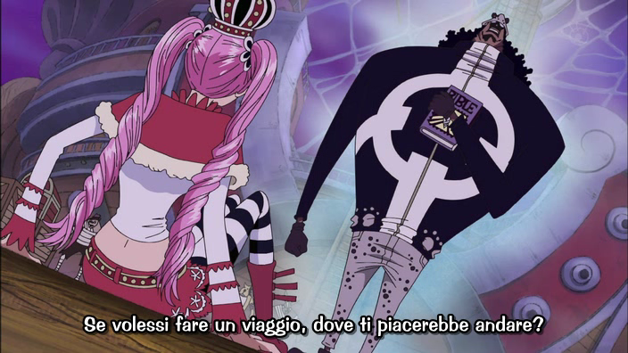 Oz, però ,è talmente cretino da tirarsi un pugno cercando di scacciarli,e da cadere in un’altro trucco di tale livello. Si vede ha l’ombra di Rufy.:°D Nami nel frattempo arriva alla Sunny, e Perona ovviamente,sembra pronta a contrastarla.