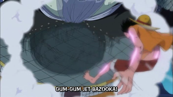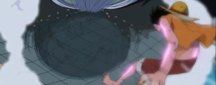Zoro dice che sconfiggere Moria, accecato dalla rabbia e dall’orgoglio, è solo questione di tempo: faranno prima loro a sparire o Moria ad autodistruggersi? Ben più importante è il fatto che ormai il sole sta sorgendo: è una lotta contro il tempo, piuttosto che contro Moria. Rufy usa il Gear 2nd e passa subito all’attacco, colpendo allo stomaco Moria e facendogli sputare alcune ombre. Cappello di paglia rincara la dose e altre ombre escono, poichè neanche Moria può controllare tutte quelle ombre e rimanere lucido.