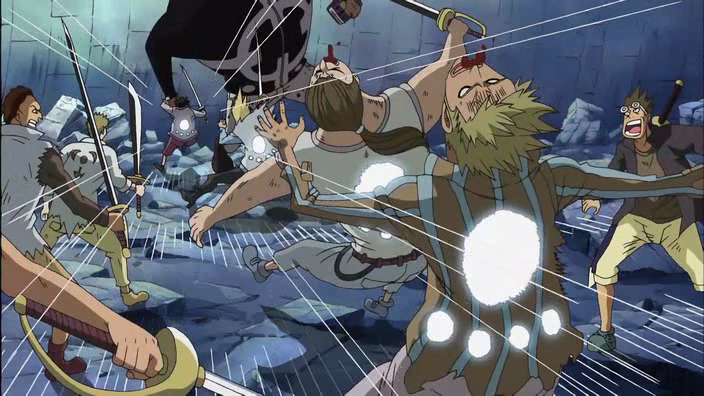 Dal lumacofono di Orso giungono degli ordini chiari: mantenere Moria nella Flotta Dei Sette, visto che non possono permettersi di perderne un’altro, ora che il successore di Crocodile è stato scelto, ed uccidere tutti i presenti sull’isola. Bartholomew lentamente si toglie i guanti e si teletrasporta tra i pirati, usando poi uno strano attacco che scaraventa via anche quelli che non tocca. Zoro, caparbio, si prepara ad affrontarlo da solo…