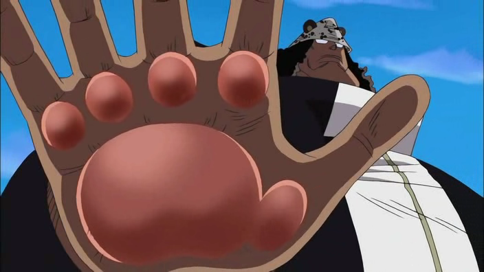 Poi prova ad usare le 36 Passione Demoniache Dela Fenice, ma Orso porge il palmo e devia l’attacco.Veniamo quindi a conoscenza del vero potere di Orso: questi ha mangiato il frutto Paw Paw (Zampa Zampa),ed ha appunto dei cuscinetti carnosi sui palmi (come gli animali,o meglio,gli Orsi ^^) che gli permettono di deviare qualunque cosa, addirittura l’aria. Franky dice che non sembra così forte,e pertutta risposta Orso gli “spara” contro un colpo (deviando l’aria), e stendendolo subito.