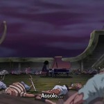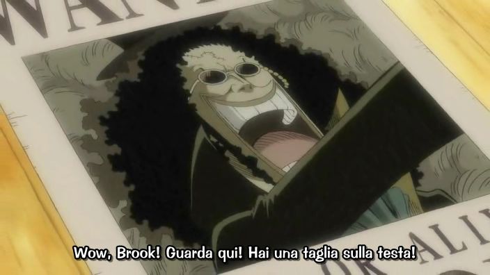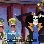 Riassunto: Il flashback continua dall’episodio precedente, mostrando Brook che si aggira per la nave,raccogliendo i teschi dei suo compagni e raccogliendoli assieme, mentre gli tornano in mente memorie di quando erano tutti vivi. Passando davanti ad uno specchio, si accorge di essere diventato uno scheletro e urla terrorizzato.