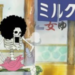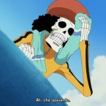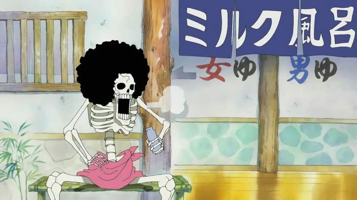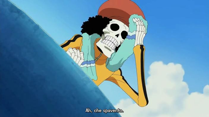 Puntata noiosetta, da segnalare Brook che si fa il bagno coprendosi le parti intime con un’asciugamano (quali parti intime?! XD), che spara poi un bel rutto baritonale, e sempre Brook, con la tuta de La Sposa di Kill Bill. Speriamo che questa saga duri poco, ma non ci metterei la mano sul fuoco…..