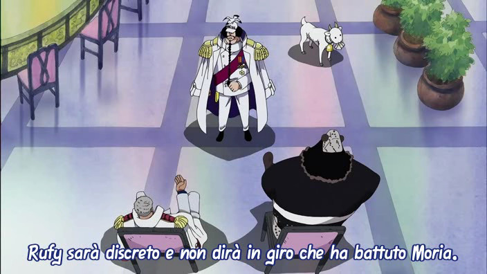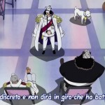 Riassunto: Dopo un pugno di filler, torniamo alla trama principale. Nella terra santa di Mariejoa, sede della Marina, Kuma è appena tornato a fare rapporto a Sengoku, ovviamente adirato con Bartholomew, visto che aveva dato l’ordine di sterminare tutti i presenti a Thriller Bark. Il Tiranno dalla sua rimane silente, e non spiccica parola.