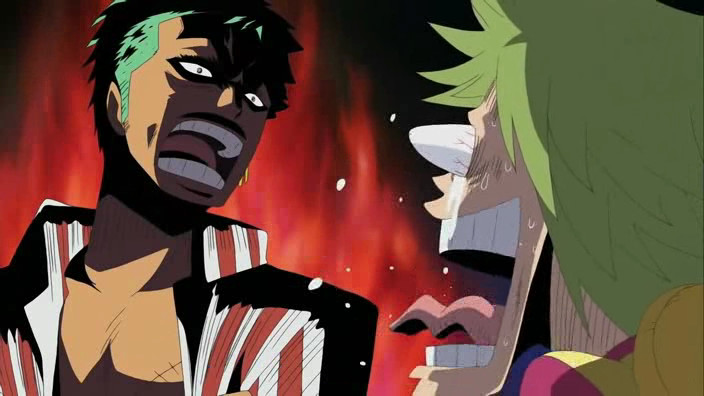 Hacchi, messo dentro una gabbia, per cercare di non farsi riconoscere dalla ciurma di Cappello di paglia, si annerisce