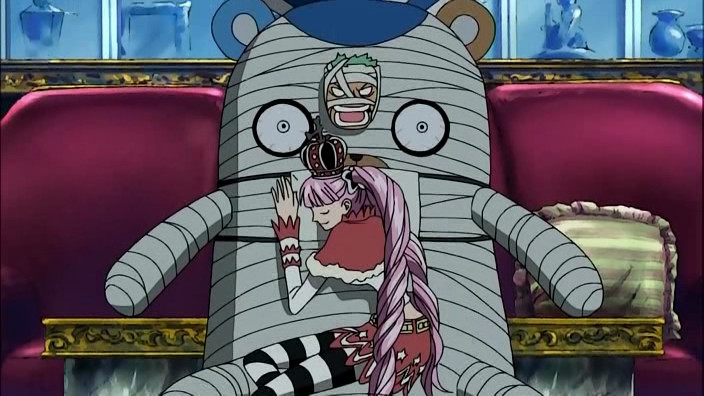 Zoro è finito nell’Isola Tenebrosa, una paludosa e paurosa isola della Rotta maggiore ma non è l’unica presenza dell’isola… Anche la Nobile Perona, un ex servitrice di Moria della Flotta dei Sette, era stata destinata a quest’isola da Bartholomew, in risposta alla domanda: “Dove ti piacerebbe andare?”. Questa ragazza ha i poteri del frutto Horo Horo, che le permette di creare una serie di fantasmini che causano negatività a chi vi entra in contatto. Essendo Perona da sola in quest’isola, sceglie Zoro come suo nuovo servo e lo sottomette con il suo straordinario potere. Riuscirà Zoro a tornare dai suoi amici? E come riuscirà a raggiungerli visto il suo pessimo senso dell’orientamento? ( Zoro lo spadaccino riesce a perdersi anche in una stanza! ).