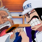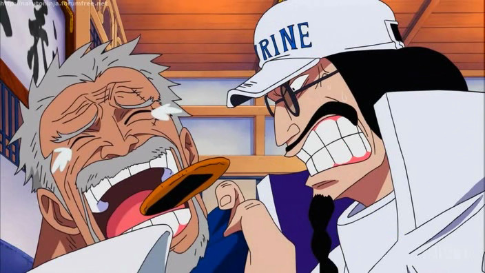 A Marineford intanto, il Grand’Ammiraglio Sengoku Il Misericordioso, viene informato dell’impresa, finora mai riuscita, di eludere le difese di Impel Down, da parte di Rufy, nipote nientedimeno che di Garp, il grande eroe della Marina. Se non fosse per la sua fama, Sengoku avrebbe voluto già cacciare il vecchio Vice Ammiraglio, che nella sua famiglia conta un sacco di criminali famosi, tra cui Dragon il Rivoluzionario, padre di Rufy. Garp d’altro canto sembra orgoglioso dell’impresa del nipote…