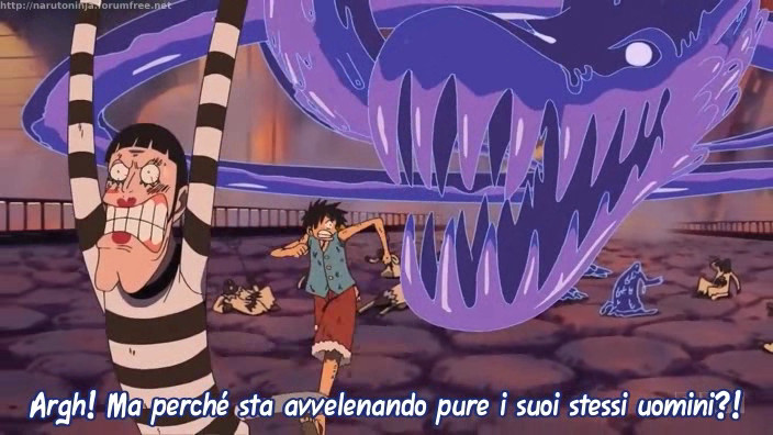 Riassunto: la corsa di Rufy, che si dirigeva verso le cucine della prigione di Impel Down, è stata interrotta dal Direttore Magellan, il quale non intende lasciare che un pirata metta in discussione l’impenetrabilità della sua prigione, proprio mentre lui occupa la posizione di direttore! Pertanto il possessore del frutto Doku Doku, un uomo in grado di secernere veleno in grandi quantità, è intenzionato a spedire Rufy dietro le sbarre, non prima però di aver confessato il modo in cui si è introdotto nella Prigione. Rufy non svelerebbe il tradimento di Boa Hancock e non è nemmeno intenzionato a lasciar giustiziare suo fratello; lo scontro con Magellan è inevitabile!
