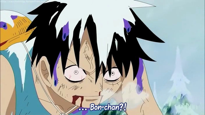 Mr2 non demorde ed è disposto ad affrontare senza sosta anche un branco di lupi inferocito, e a proteggere il suo amico Rufy fino alla morte, ma la sola forza di volontà sembra non bastare per lui, che sta per essere sbranato dal branco, se non fosse per Rufy. Rufy, con una disperata temperanza morale, scatena la sua Ambizione, come in passato aveva già fatto, facendo svenire i lupi affamati. Dopo questo anche i due amici crollano stremati. Uno strano personaggio entra in scena…