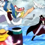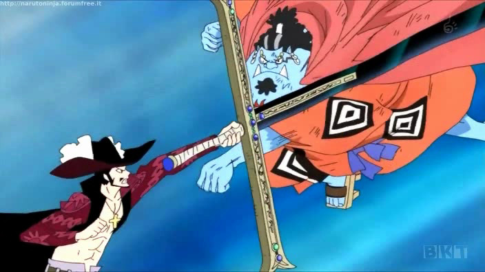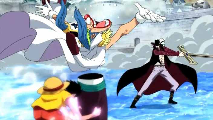 Rufy intuisce fin da subito la potenza del suo nemico e non può far altro che tentare di evitare i suoi potentissimi fendenti. Riesce ad oltrepassarlo solo grazie all’intervento (non volontario) di Buggy, che Mihawk non può colpire con la sua spada, e all’intervento di Vista, comandante della quinta divisione di Barbabianca, nonché famoso spadaccino.