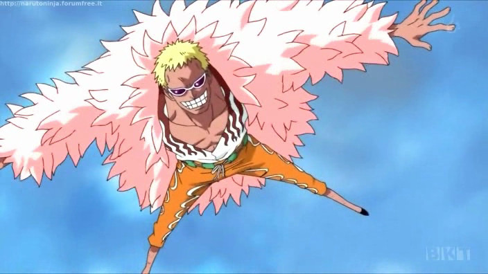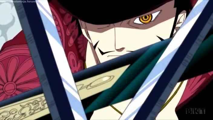 Riassunto: Drakul Mihawk dimostra ancora una volta di essere il miglior spadaccino al mondo. Lui brandisce la lama Kokutou Yoru, la spada nera in grado di tagliare qualsiasi cosa e Rufy si trova in gran difficoltà contro il membro della Flotta dei Sette.