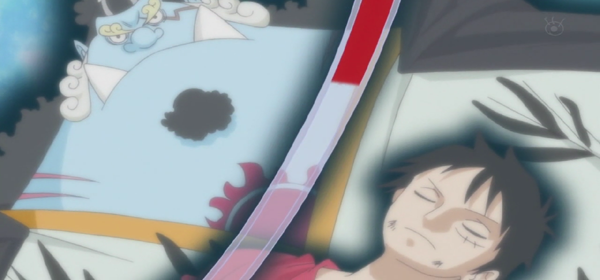 Riassunto: la battaglia si è conclusa. Hody Jones, la sua ciurma Van Der Decken sono stati definitivamente sconfitti. L’arca Noah, che minacciava di distruggere l’isola degli uomini pesce, ora viene adagiata al sicuro nel fondale marino da giganteschi re del mare accorsi grazie alle grida disperate di Shirahoshi. Le sirene che erano state rapite ora sono state ritrovate e Mugiwara discolpati. Tutto sembra essere andato per il meglio. Rufy tuttavia è in gravi condizioni; Hody Jones gli ha inferto una profonda ferita alla spalla, ferita che Rufy non ha fatto altro che allargare ed aggravare combattendo fino allo stremo per salvare l’isola. Ora la sua vita è pericolo: se non gli venisse fatta una trasfusione in tempo, Rufy morirebbe a causa del troppo sangue perso. Nessuno fra gli uomini pesce si fa avanti, nonostante Rufy abbia salvato tutti quanti: una vecchia legge, mai dimenticata, vieta le donazioni di sangue agli esseri umani. Tuttavia Jinbe, che rimane un pirata, non tenuto a seguire leggi, si offre per salvare il suo amico…