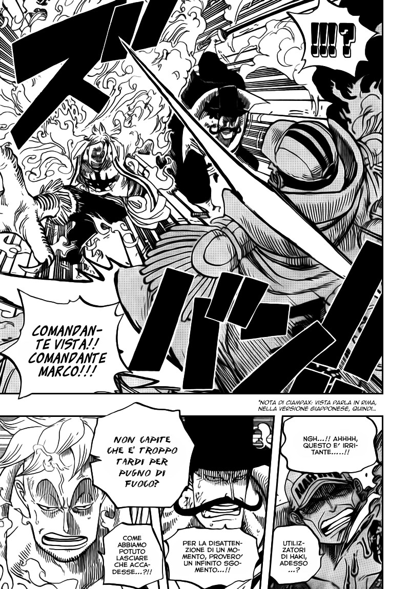 Riassunto: Dopo essere stato ferito da Akainu, Ace si accascia al suolo tra le braccia di Rufy. Pirati, alleati vari, lo stesso jimbe e i comandanti Marco e Vista attaccano Akainu per allontanarlo da Pugno di Fuoco, riuscendoci a malapena. Lo stesso nonno Garp, rivolgendosi a Sengoku, gli intima di tenerlo fermo, altrimenti egli stesso metterà fine alla vita dell’Ammiraglio Sakazuki.