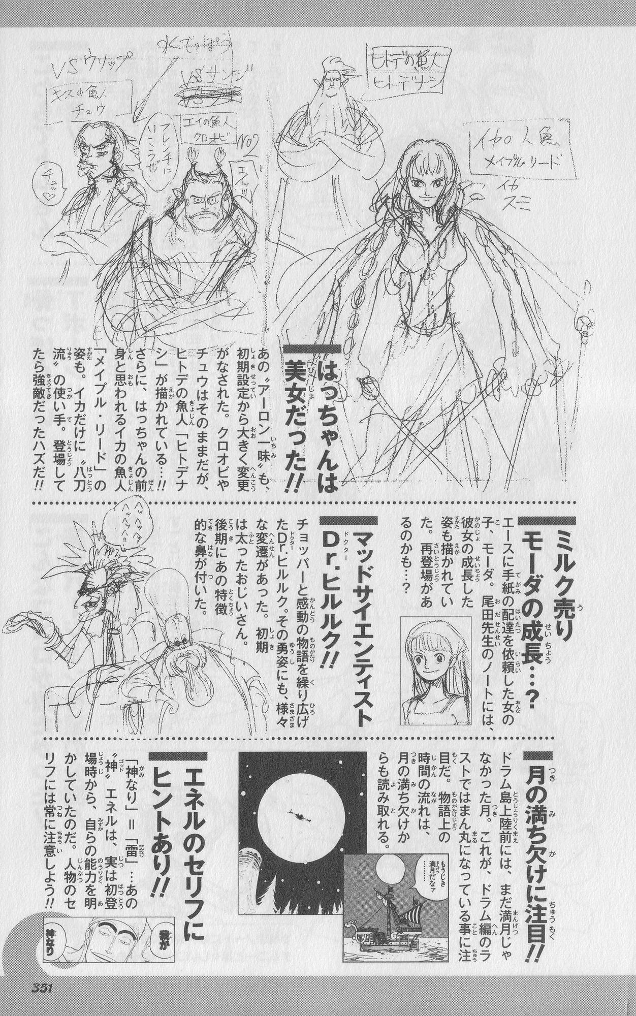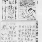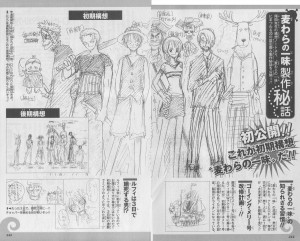 Ad Eiichiro Oda è sempre stato abbastanza chiaro che la ciurma di Rufy sarebbe stata composta da nove elementi (più forse un decimo membro che si unirà alla ciurma nel Nuovo Mondo, come sempre rivelato in questo volume) solamente che dall’inizio le sue idee sono un po’ mutate. Confrontate questo antichissimo schizzo con la ciurma che conoscete adesso … Notate delle differenze?