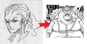 Mentre Oda per Rufy, Nami, Zoro e Naruto (si, avete letto bene, era questo il nome originale di Sanji, poi cambiato per via dell’uscita di un certo manga omonimo) aveva le idee chiare fin dall’inizio, per gli altri ha avuto dei (fortunati) ripensamenti. Usop rimaneva il cecchino del gruppo ma nell’aspetto ricordava molto l’attuale Barbanera, Brook, che era stato pensato fin dall’inizio, non aveva la bellissima chioma afro che lo contraddistingue ora, Chopper inizialmente era un ibrido fra una zebra e una renna che fumava continuamente un sigaro, Franky era leggermente meno muscoloso di adesso e, oltretutto, non era il carpentiere della ciurma ma il suo armaiolo. Il nanetto che si vede a sinistra era il carpentiere della ciurma, poi sostituto dalla bella archeologa Nico Robin che però all’inizio non era stata pensata ma si sa che le idee migliori vengono sempre all’ultimo momento.