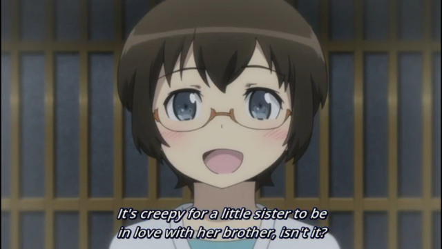 I Giapponesi hanno una cultura diversa, e sebbene condannino anche loro questi comportamenti è vero che esistono i cosiddetti “siscon“, persone che provano attrazione per una o più sorelle (reali o no) che può essere, ma non necessariamente, anche di natura sessuale. Si tratta comunque di persone che nella maggior parte dei casi non toccherebbero con un dito le loro sorelle reali: in Giappone è molto forte il sentimento privato delle proprie perversioni, e i rischi che questi corrono rivelando la propria natura possono essere anche più gravi di quelli affrontati in occidente, dove per certe cose (meno per altre) abbiamo una mentalità più “aperta“. Ma mentre in Giappone il fenomeno dei siscon viene additato e attaccato, usato da non-giapponesi per indicare quanto “malata” sia quella cultura, ricordo che tali misfatti sono più comuni da noi di quanto si possa immaginare… certo, molto meno comuni di quanto potevano esserlo una quarantina di anni fa, quando il nostro paese era ancora ancorato a canoni culturali tipici di società agricole. E non possiamo sapere esattamente quanto comuni perchè nella maggior parte dei casi sono violenze, crimini contro l’individuo e la società, che vengono taciuti e non denunciati (io sono andato a parlare, e spettegolare, con un pò di persone avanti negli anni per farmi un’idea). Ma torniamo a Oreimo.