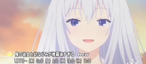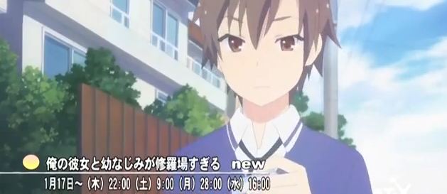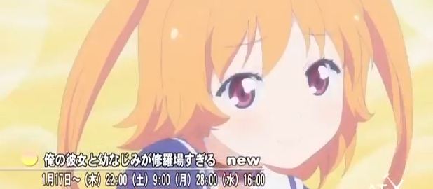 L’anime di Ore no Kanojo to Osananajimi ga Shuraba Sugiru sarà trasmesso in anteprima dall’emittente televisiva Tokyo MX TV e da altre stazioni sabato di questa settimana (5 Gennaio), mentre il canale AT-X comincerà a trasmetterla a partire dal 17 Gennaio. AT-X deve parte della sua fama al fatto di poter trasmettere senza censure varie serie animate che, invece, erano state censurate a causa di scene di nudo o simili quando trasmesse su altri canali.