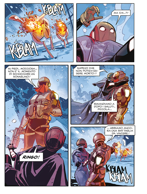 E tanto nella parte nel presente, dove Mocciosa in un’operazione vede Ringo, che sembra aiutarla…ma riesce a vederlo solo lei. Che Ringo/Pistolero sia morto, e che quello visto da Sam sia solo uno Spettro, o un’emanazione del ricordo che lei ha del compagno di squadra (in base a quanto ipotizzavo nell’articolo precedente) sembrano suggerirlo sia l’assenza del Pistolero nell’immagine di copertina, sia il vago colore rossastro che ha la sua apparizione, lo stesso degli Spettri (e di questo si ringrazia il fatto che Orfani sia a colori). Ma la conferma, quella manca ancora.