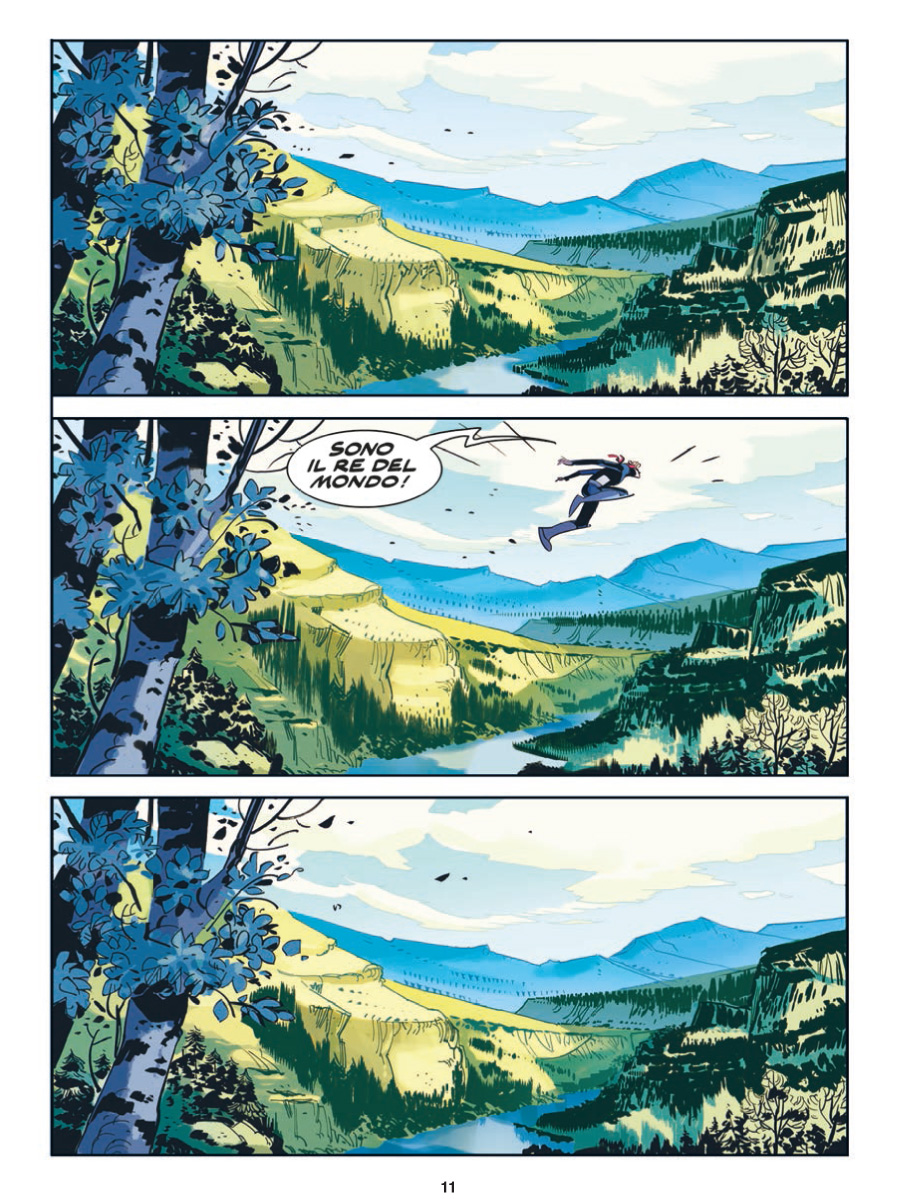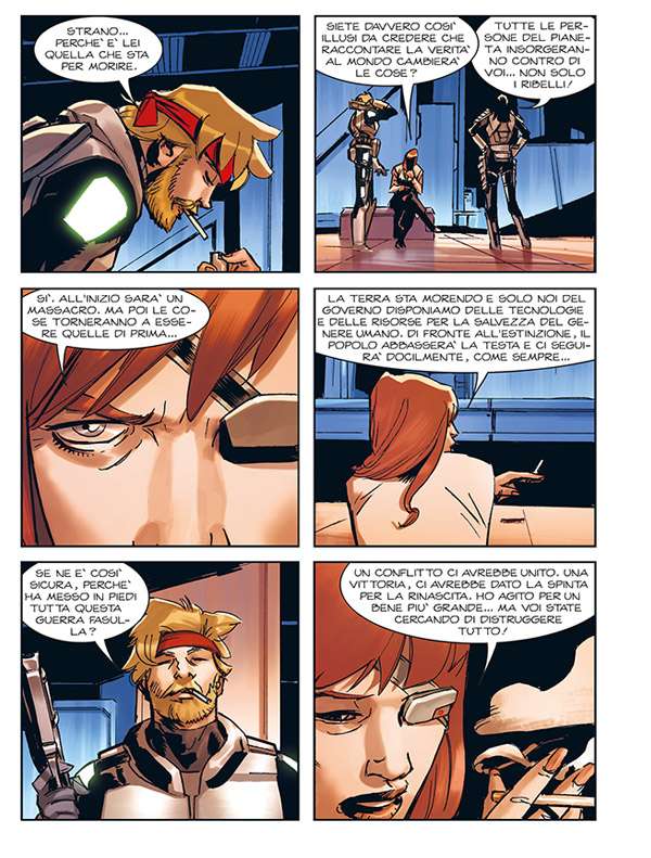 Ma la metà ‘passata’ dell’albo non si limita solo a questo: infatti ci vengono spiegati i meccanismi di funzionamento delle tute della squadra (ed il motivo di alcune loro azioni davvero sovrumane), e viene posta quella che con ogni probabilità sarà l’ambientazione degli ultimi tre numeri per quel che riguarda il passato: la prima vera missione degli Orfani, cioè l’assalto alla base fortificata di coloro che si ribellano alla legge marziale che è stata imposta sulla Terra. A questo proposito, va detto che la sequenza di apertura dell’albo (dedicata proprio alla ribellione) è qualcosa di meraviglioso, e di perfettamente reso. Quel ‘no, noi non lo capiamo’ vale tutta la lettura del numero.
