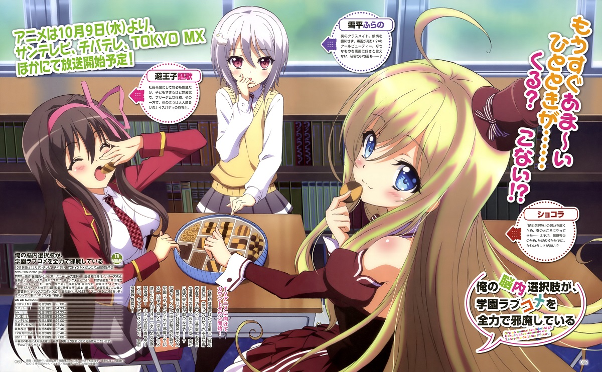 NouCome, abbreviato di Ore no Nonai Sentakushi ga, Gakuen Love Come o Zenryoku de Jama Shiteiru (Le mie scelte mentali stanno interferendo con la mia commedia romantica scolastica), nasce come light novel, edita da Kadokawa Shoten e scritta da Takeru Kasukabe, che ci lavora dal 2012. L’anime è realizzato dallo studio Diomedea, che ha prodotto Campione! e sta lavorando anche a Gingitsune (in corso), mentre ha collaborato in molte serie minori dal 2005, anno in cui è stato fondato (da un gruppo staccatosi dallo Studio TAC). Dieci gli episodi previsti.