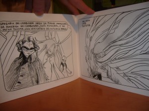 Tutto è permeato di una certa sicurezza, segno a mio avviso che l’autore prima di mettersi con il pennino in mano sapesse già dove, come e quanto inchiostro lasciar scivolare sui fogli bianchi. Mi sono invaghito delle tavole minuziose di dettagli come dei semplici muri sghembi tenuti su da qualche linea e nessuna prospettiva. Si nota, almeno io l’ho notata … o immaginata visto che non è detto esista, una certa vena orientaleggiante per quanto riguarda la rappresentazione dei personaggi. Lapis per mezzo della bocca di Napo ha più volte confessato la sua passione per i manga, non sarebbe così assurdo che si sia fatto trascinare o quantomeno guidare sotto certi aspetti. Fin qui lodi sperticate, mi chiederete di trovare un difetto. Almeno uno. Sebbene non lo ritenga personalmente come tale, direi che alcune tavole sono di difficile comprensione. Dico che non lo ritengo come tale in primis perchè una qualsiasi opera merita concentrazione e poi perchè ad una seconda o terza lettura tutto si chiarifica portando il lettore ad una fluency nella lettura “normale”.