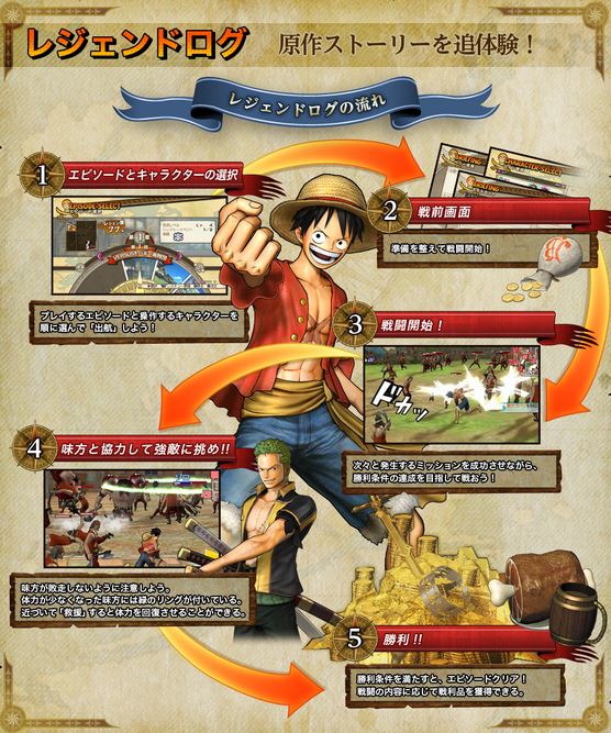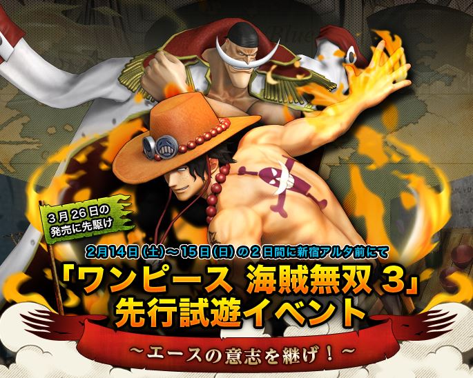 One Piece: Pirate Warriors 3 uscirà in Giappone il 26 Marzo. Le prime copie del videogioco includeranno un codice speciale per sbloccare Sabo, un codice per permettere a Rufy di indossare dei costumi speciali, e un codice per ottenere un personaggio nel videogioco per smartphone di One Piece Treasure Cruise. La Sony, inoltre, ha distribuito per l’occasione un’edizione speciale della PS4 riservata al mercato giapponese.