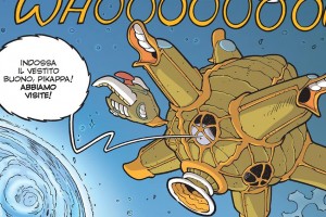 Il pericolo che Pikappa si trova ad affrontare, o in altre parole la trama della storia, ci viene spiegata in questo primo episodio: Artibani la costruisce in piena continuità, andando a prendere la maggior parte di quelle trame lasciate in sospeso in PKNA e tirando fuori personaggi che erano apparsi in un’unico numero svariati anni fa (chi si ricorda di Nebula Faraday?). Per l’occasione, vengono uniti per la prima volta i due grandi filoni della narrativa pikappica, cioè quello dei viaggi nel tempo e quello degli alieni (tradotto, vediamo Razziatore ed Evroniani nella stessa storia). E’ comunque evidente che siamo di fronte ad una trama strutturata con maestria, nel pieno rispetto di tutto quello che PK ha raccontato finora…e solo chi si è occupato del progetto fin dai suoi inizi poteva riuscirci.