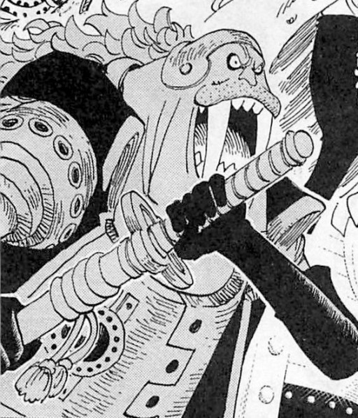 Blamenco, (1) capitano della Sesta divisione della Flotta di Barbabianca, riesce ad estrarre da tasche poste al di sotto del suo mento, un enorme martello, due volte più grande di lui.