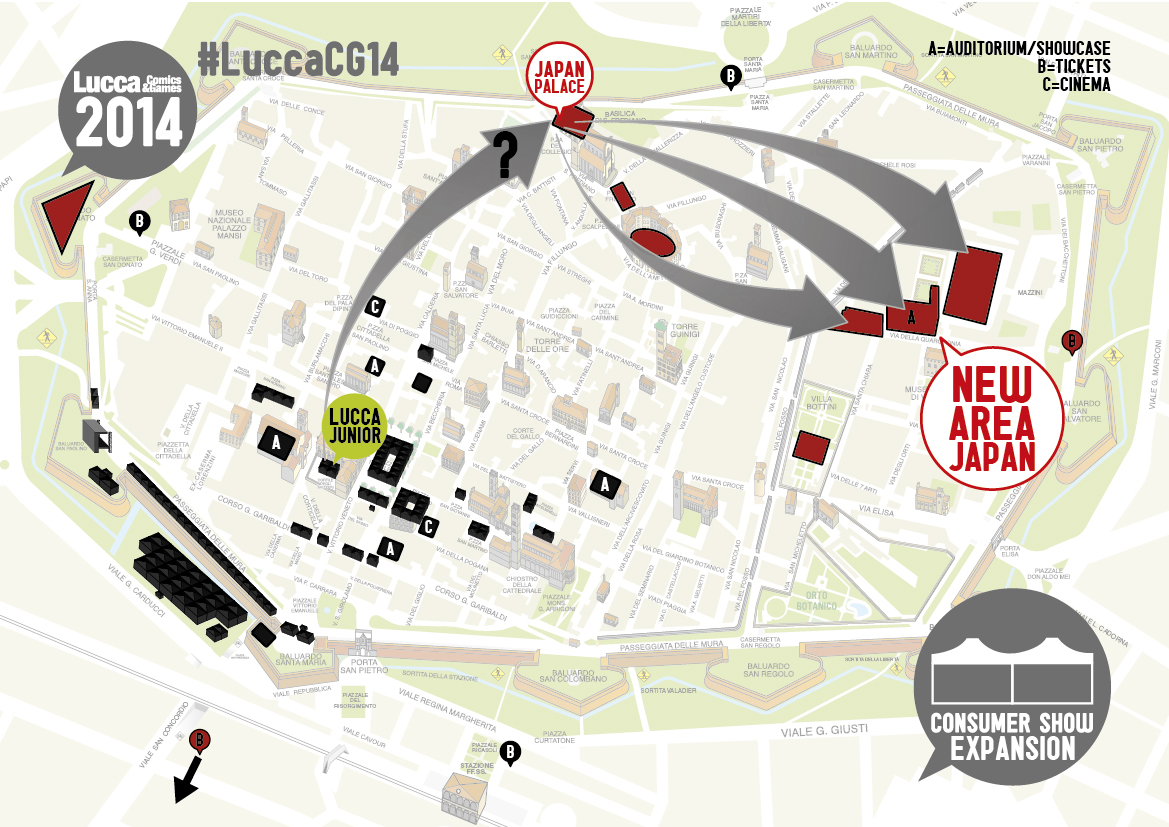 Ieri è stato rilasciato il seguente comunicato ufficiale da parte di Lucca Comics & Games riguardante l’edizione 2014: se i sopralluloghi dei prossimi giorni fatti, presumibilmente, dai tecnici del comune di Lucca andranno a buon fine e sarà dato l’OK per l’utilizzo dei nuovi spazi, avremo molte novità, in particolare per quanto riguarda l’area Japan (il “vecchio” Japan Palace) e l’area Junior che era, fino ad ora, ospitata nel cortile del Palazzo di fianco a Piazza Napoleone. Ecco l’estratto del comunicato stampa relativo alle novità sopra accennate.