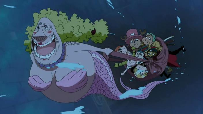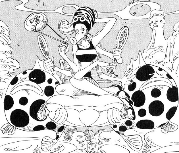 Non vorrei soffermarmi troppo su queste razze, poiché con l’imminente arrivo della Ciurma di Cappello di Paglia nell’Isola degli uomini pesce ci sarà molto di più su cui discutere e meriteranno un approfondimento specifico. Ciò che mi preme di più sottolineare è che le sirene non sono il corrispettivo femminile degli uomini pesce, ma sono due razze completamente diverse che hanno in comune il fatto di poter vivere e respirare sott’acqua. Infatti, esistono sia le donne pesce, che i tritoni; mentre questi ultimi non sono ancora apparsi nel manga, per quanto riguarda le donne pesce Oda ci ha fornito un unico esempio, Octopako, comparsa nelle Miniavventure di Hacchan e di cui l’uomo pesce era innamorato.