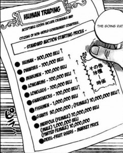 elle razze, che popolano la Rotta Maggiore e non solo, Eiichiro Oda ce lo fornisce nel lontano capitolo 501. Leggendo il depliant della casa d’aste umana dell’Arcipelago Sabaody, ci si può fare un’idea di cosa ci dovremo aspettare nel prossimo futuro.