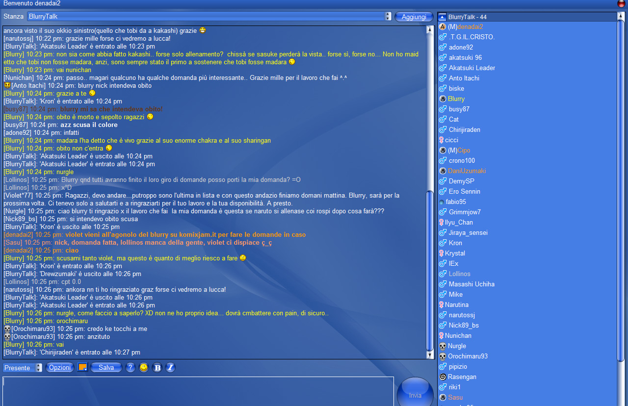 denadai2: mi presento, piacere sono denadai2 di www.komixjam.it. prima di annunciare il premio da dare ad uno di voi per questo appuntamento, vorrei dire due paroline: vorrei ringraziare www.narutoita.net per l’appoggio nella creazione di questa chat, ma anche www.akatsukifan.org, www.narutoplanet.it che ci sono stati vicini in questo progetto. Speriamo, sulla cresta di questa aria di collaborazione, di creare nuovi e continui eventi ed organizzazioni per il bene del mondo narutoniano